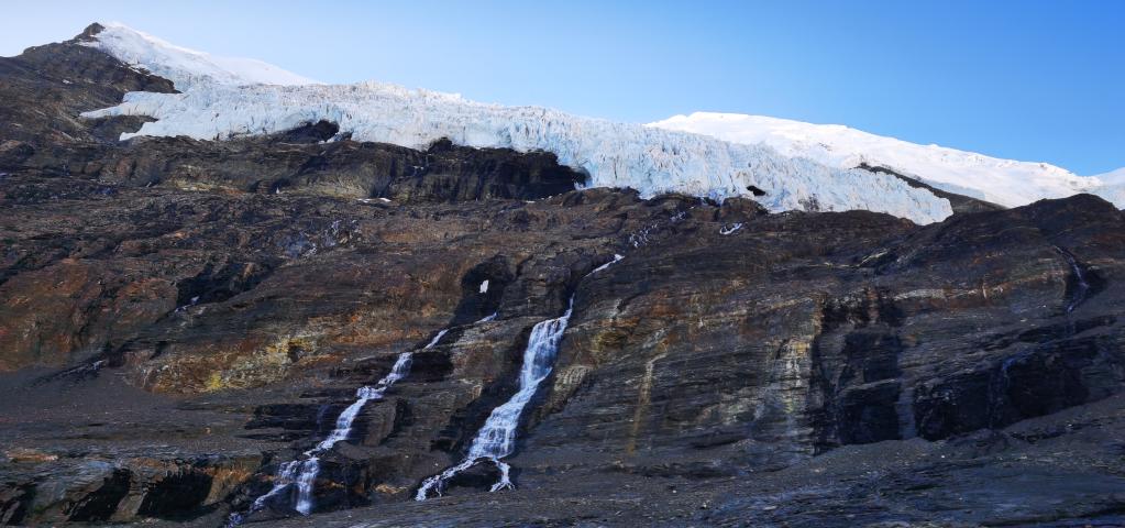 這是位于山南市浪卡子縣的卡若拉冰川,冰川融水形成河流(6月3日攝,無人機(jī)照片)。新華社記者 沈虹冰 攝
