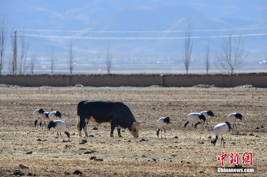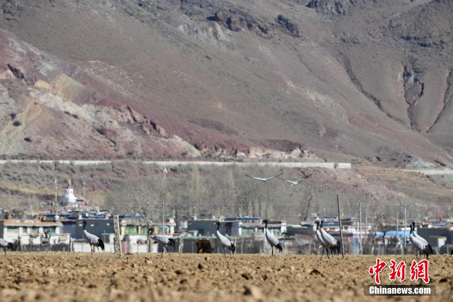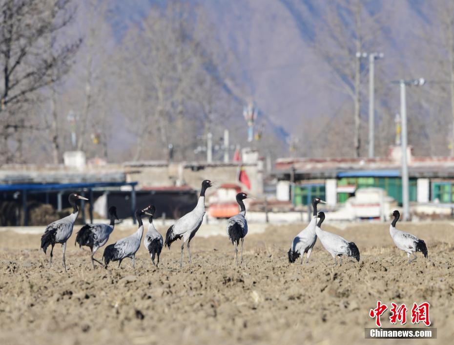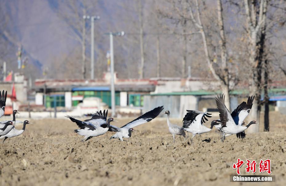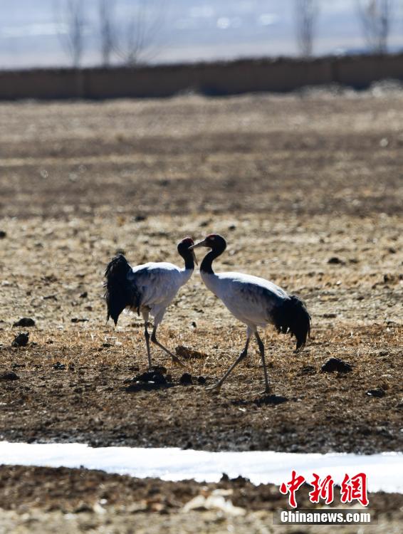 每年的10月底,成群的黑頸鶴飛到西藏拉薩市林周縣越冬,在拉薩市林周縣周邊的湖泊濕地度過5個月的“閑云野鶴”生活,次年三四月份再飛向藏北草原繁殖。黑頸鶴是世界上唯一一種高原鶴類。具有足長、喙長、頸長的典型涉禽類特征,適合在沼澤地里行走。黑頸鶴的頸、尾為黑色,體羽為灰白色。黑頸鶴是國家一級保護動物。目前,每年到林周縣越冬的黑頸鶴已達2000只左右。圖為黑頸鶴在林周境內(nèi)的農(nóng)田里覓食、嬉戲。 貢嘎來松 攝