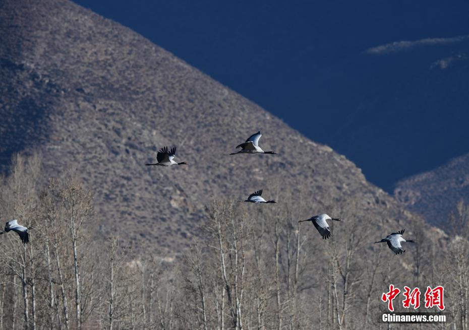每年的10月底,成群的黑頸鶴飛到西藏拉薩市林周縣越冬,在拉薩市林周縣周邊的湖泊濕地度過5個月的“閑云野鶴”生活,次年三四月份再飛向藏北草原繁殖。黑頸鶴是世界上唯一一種高原鶴類。具有足長、喙長、頸長的典型涉禽類特征,適合在沼澤地里行走。黑頸鶴的頸、尾為黑色,體羽為灰白色。黑頸鶴是國家一級保護動物。目前,每年到林周縣越冬的黑頸鶴已達2000只左右。圖為黑頸鶴在林周境內(nèi)的農(nóng)田上空飛翔。 貢嘎來松 攝