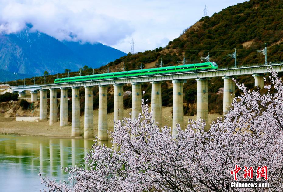 近日,中國鐵路青藏集團(tuán)有限公司介紹,3月下旬至4月,拉林鐵路沿線綿延的野生桃花林盛開,藍(lán)天、白云、桃花、雪山、高原復(fù)興號動車等相互交織,形成了一幅幅美不勝收的畫面。圖為穿梭在桃花林中的拉林鐵路高原復(fù)興號。