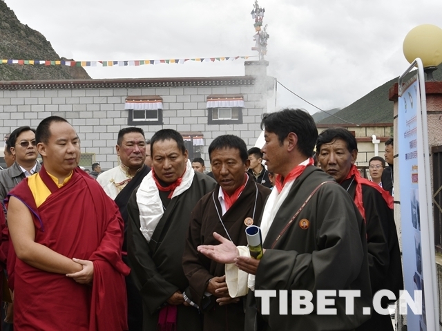 在雪林斯布牧場專業(yè)合作社考察調研過程中,十一世班禪通過參觀宣傳展板、聽取相關負責人匯報、參觀乳制品加工廠房等,詳細了解合作社的生產管理及運營。每到一處宣傳展板前,十一世班禪都停留片刻,仔細聆聽相關負責人的介紹,并針對一些細節(jié)問題進行詳細詢問。在參觀乳制品加工廠時,十一世班禪對車間里擺放的酥油筒產生了濃厚的興趣,饒有興致地手握長柄活塞,打起了酥油。看到乳制品加工廠里生產出的牦牛奶渣、酥油和酸奶,十一世班禪還品嘗了奶渣。