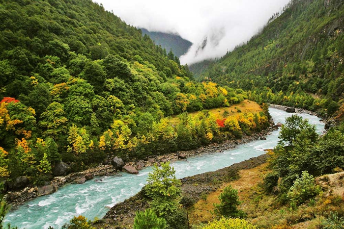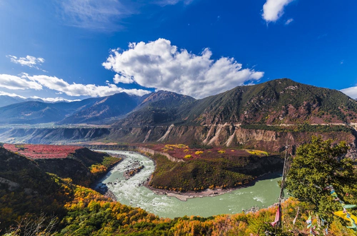 秋季的大峽谷由夏季單一的蔥蘢碧綠轉(zhuǎn)向秋季的五色斑斕。金色的松林、抬眼可見的冰川雪山,湛藍澄澈的天空,當這一切倒映在碧綠的江水中,仿佛一幅生動的油畫。