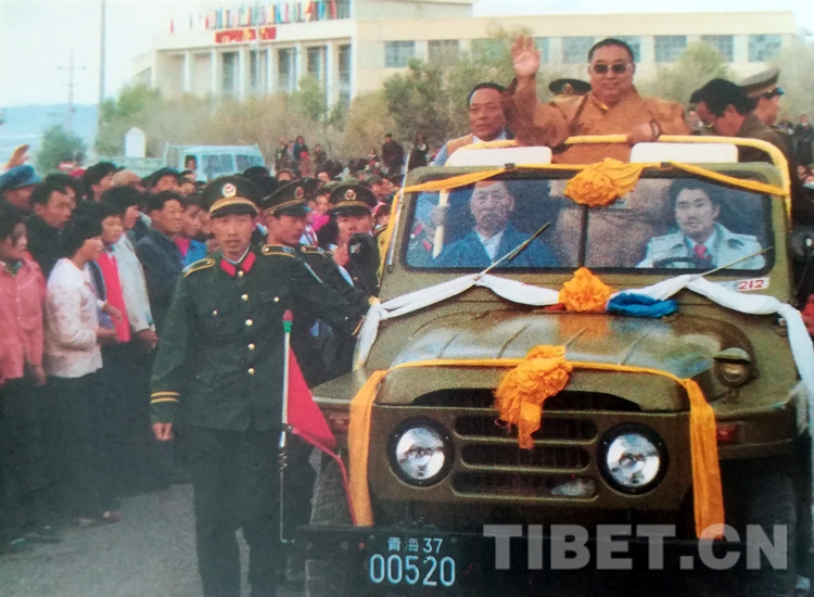 當十世班禪大師在原青海省人大常委會副主任夏茸尕布、原海南州委書記東主加的陪同下,乘敞篷車從幸福灘來到海南州州府所在地恰卜恰鎮(zhèn)時,各族人民群眾身著節(jié)日盛裝,載歌載舞,熱烈歡迎十世班禪大師。十世班禪神采奕奕,精神飽滿,高興地向各族群眾招手致意。