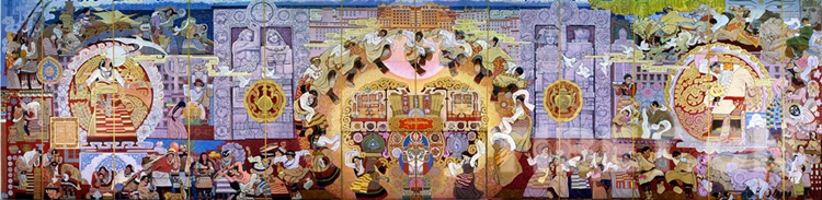 壁畫左面主體為手舉火把辭舊的西藏牧區(qū)婦女,她的四周環(huán)繞著吃古突、沐浴、背水、鳴槍、拋五谷、彈六弦、熱巴舞等活動(dòng)場(chǎng)面,以及手捧果實(shí)的門巴族、珞巴族人物。