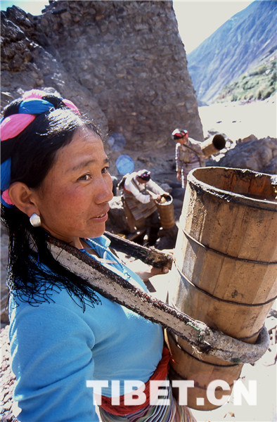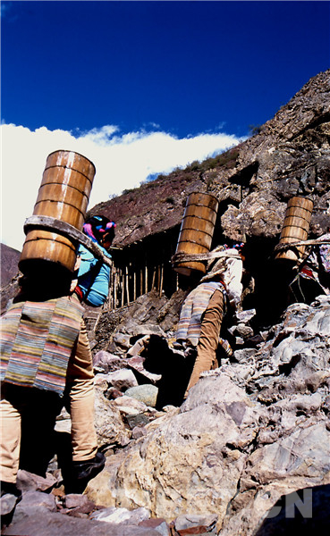 鹽田里的事自古就是由女人操持的,按她們的解釋是因?yàn)槟腥舜中模瑫?huì)弄臟了白花花的鹽,賣不出好價(jià)去。所以男人就負(fù)責(zé)運(yùn)輸和銷售工作,他們會(huì)在女人已經(jīng)曬出小山樣的一堆鹽巴時(shí),趕著騾馬來把鹽馱走,然后跋山涉水到巴塘、德欽、昌都一帶,換錢糧或者茶葉。而女人就用自己的雙肩背起水桶,下到陡峭的江邊汲水,再沿著細(xì)小的棧道背到用木支架撐起的鹽田里,等無數(shù)桶鹵水將鹽田灌滿后,剩下的就是盼著陽光和風(fēng)快快將水分蒸干,第二天就可以收獲了。她們就這樣日復(fù)一日年復(fù)一年地將狹窄的山路踩踏了千萬遍。
