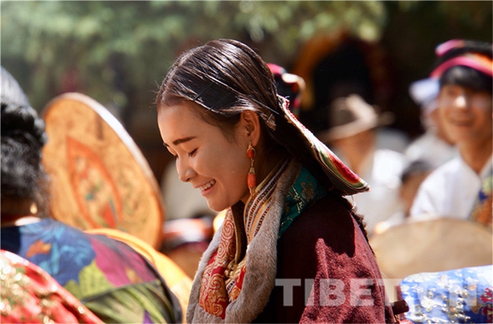六月會期間有多場舞蹈表演,參與者是年輕的未婚女子,她們穿上最隆重的藏袍,綴上珊瑚蜜蠟松石銀飾,精施粉黛,莊重優(yōu)雅地舉手抬步緩行。舞蹈的動作簡單緩慢,但是女孩子們個個奪目。