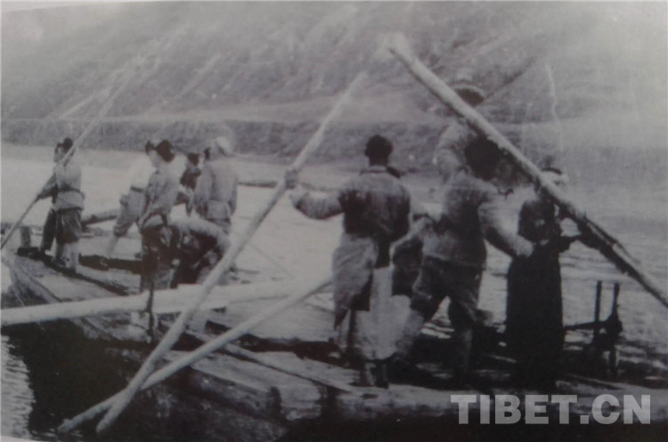 圖為1950年7月,154團在金沙江上造的第一艘能載汽車的大木船。