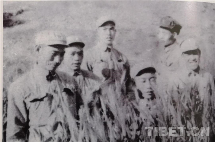 圖為1951年8月,先遣154團在生產(chǎn)基地的青稞地里分享豐收的喜悅。左起保衛(wèi)股長洪振寰、技術(shù)書記胡翼程、副正教孫從善、楊軍、郄晉武、見習(xí)干事殷繼凡。