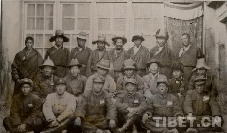 圖為1951年11月22日,進藏先遣團舉行江孜上層第一次茶話會,經(jīng)過座談協(xié)商解決了部隊采購、開荒生產(chǎn)土地等問題。圖為全體參會人員合影。一排右三為楊軍、右四為郄晉武。
