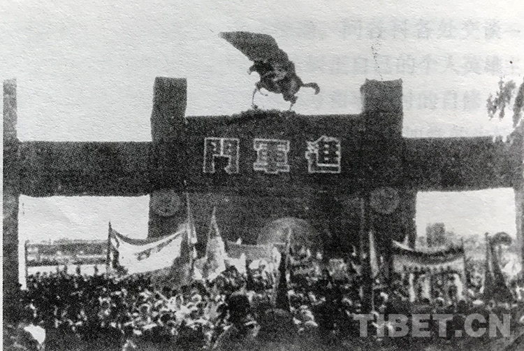 下午四點(diǎn),部隊(duì)開始進(jìn)入進(jìn)軍西藏誓師大會(huì)會(huì)場(chǎng)。進(jìn)軍門上方,一旗、一人、一馬,士氣高昂、整裝待發(fā);進(jìn)軍門前,打著紅綠標(biāo)語的各界人士和群眾高呼著:“進(jìn)軍西藏,你們走到哪里,我們支持到哪里!”整整兩萬人的部隊(duì)和群眾陸續(xù)通過特意布置的進(jìn)軍門進(jìn)入布滿紅色標(biāo)語的三蘇公園。