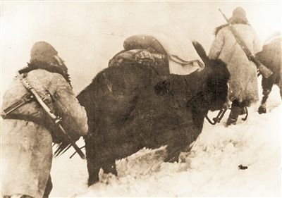 圖為先遣連官兵們拽著牦牛的尾巴上雪山。圖片來源:解放軍報(bào)