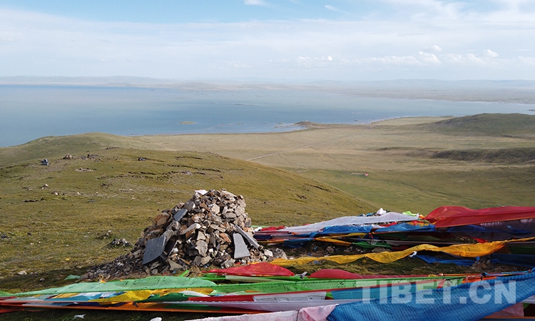 圖為湖邊的瑪尼石堆和迎風飄揚的經(jīng)幡 攝影:楊月云