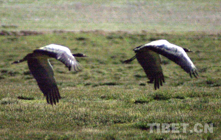 圖為正在色林錯國家級自然保護(hù)區(qū)飛翔的黑頸鶴(唐召明2001年攝)