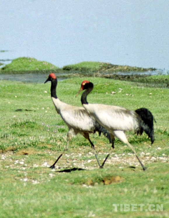 圖為一對在色林錯國家級自然保護(hù)區(qū)湖邊漫步的黑頸鶴(唐召明2001年攝)