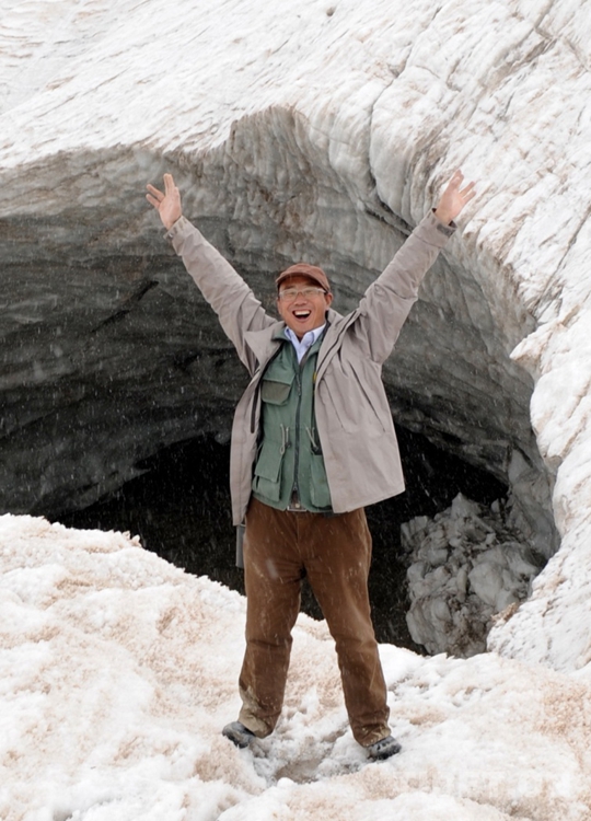 唐召明在普若崗日冰原的冰洞前留影。(唐召明提供,2009年8月4日攝)