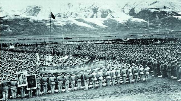 圖為修建進(jìn)藏公路的部隊(duì)進(jìn)行動(dòng)員大會(huì)。圖片來源:人民網(wǎng)
