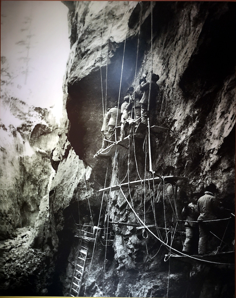 圖為懸空打炮眼。在峰巒險(xiǎn)峻的雀兒山開鑿石方,全靠人工用鋼針打眼、放炮。翻拍:李元梅