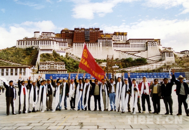 圖為藏北高原無人區(qū)科考團人員在拉薩布達拉宮前揮旗出征無人區(qū),并合影留念(唐召明2001年6月26日攝)