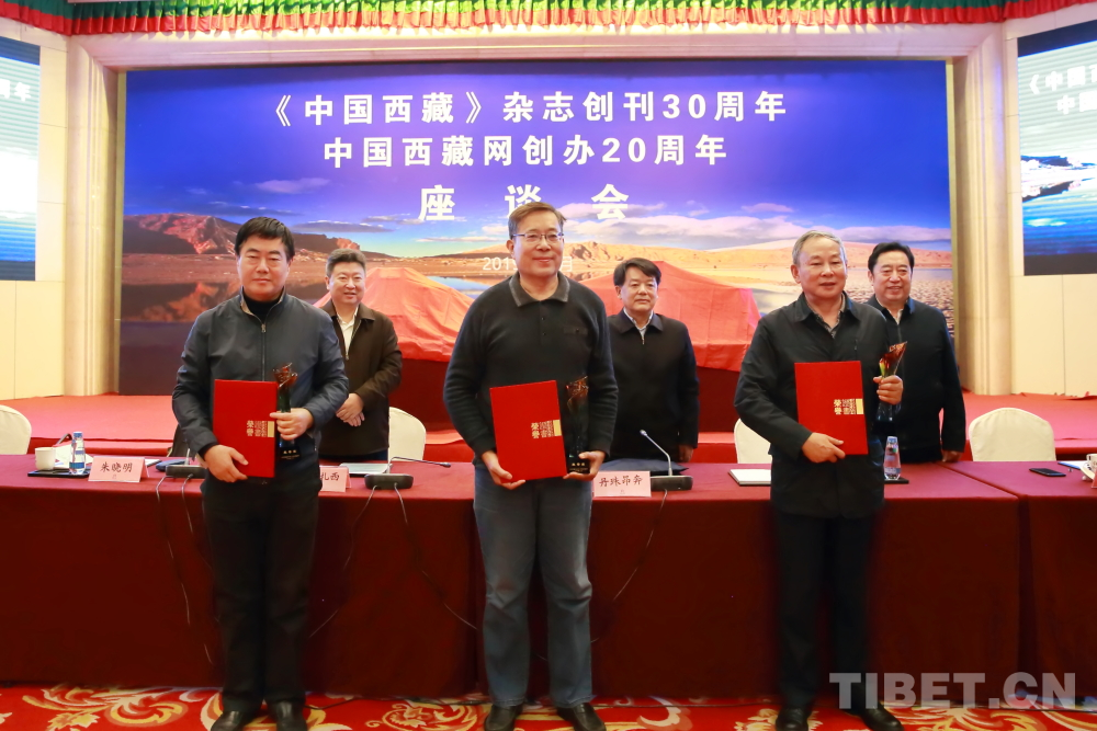 圖為全國(guó)人大民族委員會(huì)副主任委員丹珠昂奔(后排中),青海省委常委、統(tǒng)戰(zhàn)部部長(zhǎng)公保扎西(后排左)、四川省政協(xié)原副主席羅布江村(后排右)為中國(guó)西藏雜志社退休老領(lǐng)導(dǎo)頒發(fā)榮譽(yù)證書(shū)