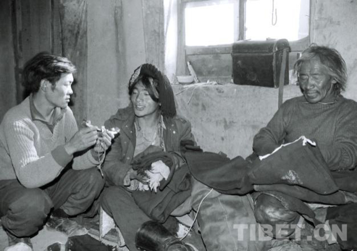 這是嘎措鄉(xiāng)日瑪(左)在原土房里與來家里的流動商販交流,購買物品。(唐召明1987年攝)