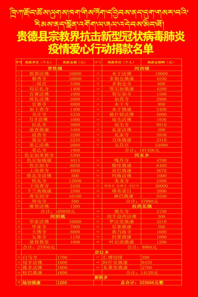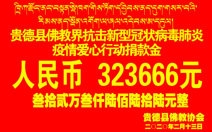 “一方有難、八方支援”。2月7日,隨著疫情防控形勢嚴峻復雜,相關醫(yī)療物資緊缺,貴德縣佛教協(xié)會主動向全縣佛教界提出倡議,為疫情防控工作伸出援手、獻出愛心。截至目前,貴德縣佛教界共捐款323666元人民幣,為疫情防控奉獻愛心。