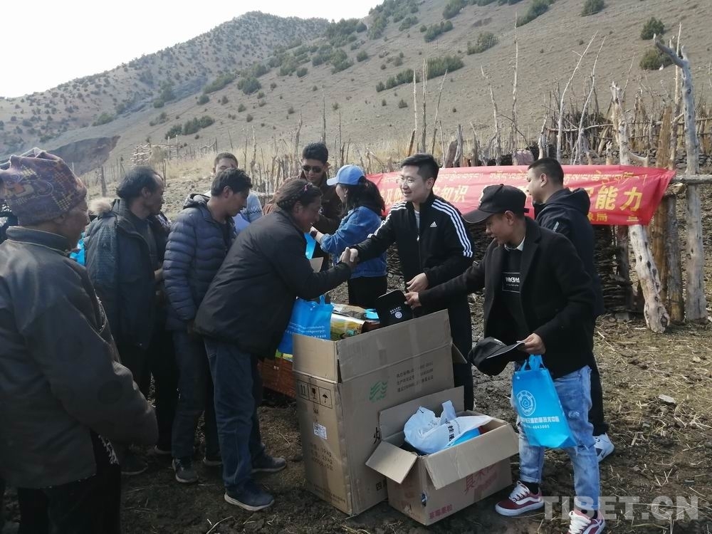 圖為工作人員在邊壩縣拉孜鄉(xiāng)蟲草采挖點向農(nóng)牧民群眾發(fā)放避險手冊等資料