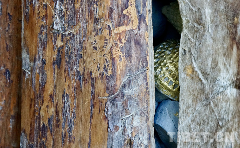上百年的羊皮經(jīng)筒,里面裝著厚厚的一匝匝經(jīng)卷,被若干次轉(zhuǎn)動(dòng)后,羊皮裂開了口子,巧手的藏族群眾用皮繩將歲月的裂口密密縫住,經(jīng)筒又可以轉(zhuǎn)繞好多年。擦康被木板封住了,小蟲在木板上啃蝕出畫作一樣的痕跡,木板縫隙中,閃耀著金色的光芒,光芒來自擦康里放置的擦塔——一個(gè)上面有著108座小塔的擦塔。
