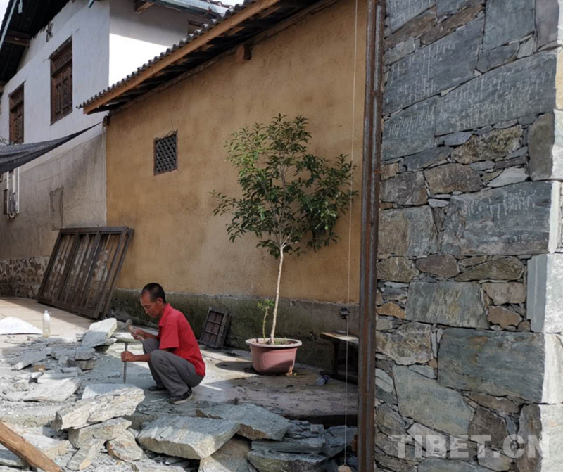漫步村間,石板鋪就的道路縱橫交錯(cuò),與居民房舍相連。鳥(niǎo)語(yǔ)蟬鳴,人與自然在這里和諧共生。遠(yuǎn)處傳來(lái)石頭的敲擊聲,沿石板路而上,循聲走近,看到一位大爺在家門(mén)口敲擊著大石塊,記者便好奇地上前詢問(wèn)。這位大爺告訴我們,他在修建自家的大門(mén)。