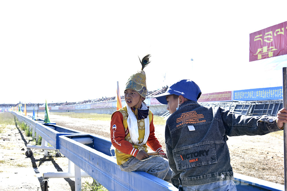 看了兩組比賽后,三兄弟奔跑到集合地點(diǎn),要準(zhǔn)備比賽了。看著哥哥拉巴桑珠和達(dá)瓦頓珠頭戴盔狀帽子、上穿黃色藏式上衣、手持竹把小鞭子,11歲的丹增久典滿是羨慕?!拔乙蚕腧T馬、去比賽,爸爸說(shuō)還不到年齡?!?/p>