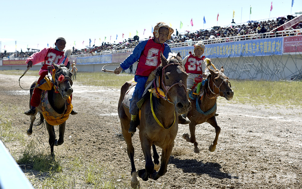圖為西藏自治區(qū)那曲市2020羌塘恰青格薩爾賽馬藝術(shù)節(jié)場(chǎng)內(nèi)速度賽馬比賽現(xiàn)場(chǎng),少年們飛馳在馬背上 攝影:王媛媛