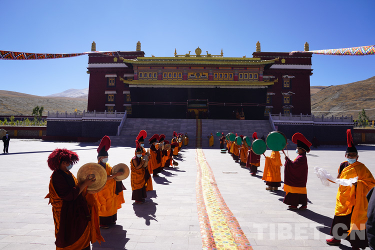 圖為薩迦寺僧眾向十一世班禪敬獻(xiàn)曼札 攝影:王淑
