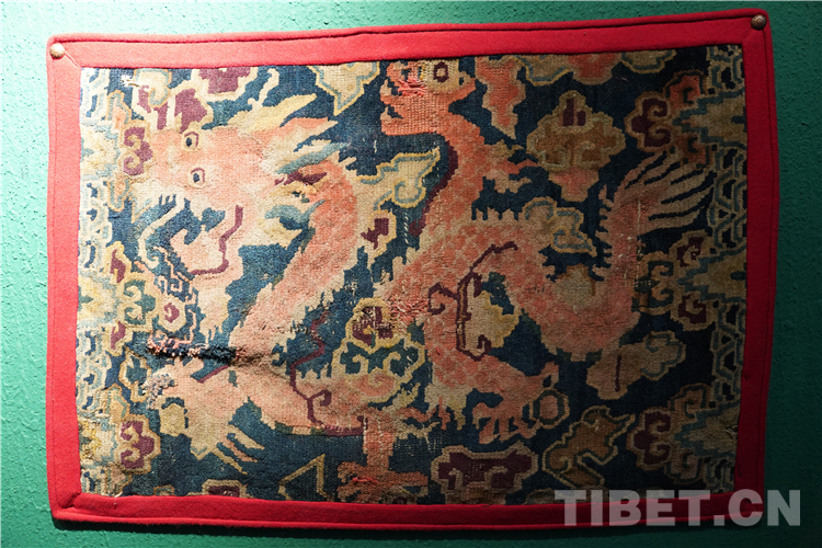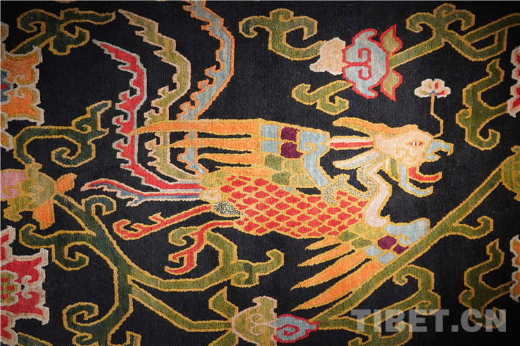 “本次展覽的藏毯,色彩搭配和編織都是技藝一絕,尤其是圖案寓意深遠(yuǎn),最具特色的是龍身鳳尾的龍鳳呈祥花紋非常精美?!苯橛^藝術(shù)中心的創(chuàng)始人徐應(yīng)龍介紹,“上半身為龍身,下半身為鳳尾,體現(xiàn)了多民族的文化交往交流交融?!?/p>