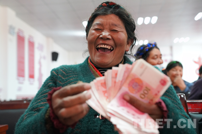 令人激動(dòng)的時(shí)刻來(lái)臨了?!岸M索朗曲珍,分紅26739元;二組支張,分紅6495元;一組朗杰曲珍,分紅2668元……”社員們?nèi)讲⒆鲀刹?,滿臉喜滋滋地依次上臺(tái)接過(guò)沉甸甸的分紅。他們?cè)诜旨t發(fā)放清單上填上名字,摁上手印后,喜笑顏開地?cái)?shù)著手里的錢。