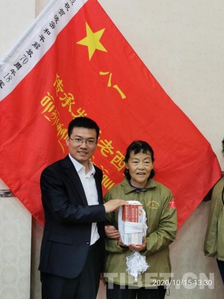 圖為原十八軍52師副政委、西藏自治區(qū)黨委原第一書記陰法唐中將之女陰建白代表父親向波密紅樓捐贈紅色書籍