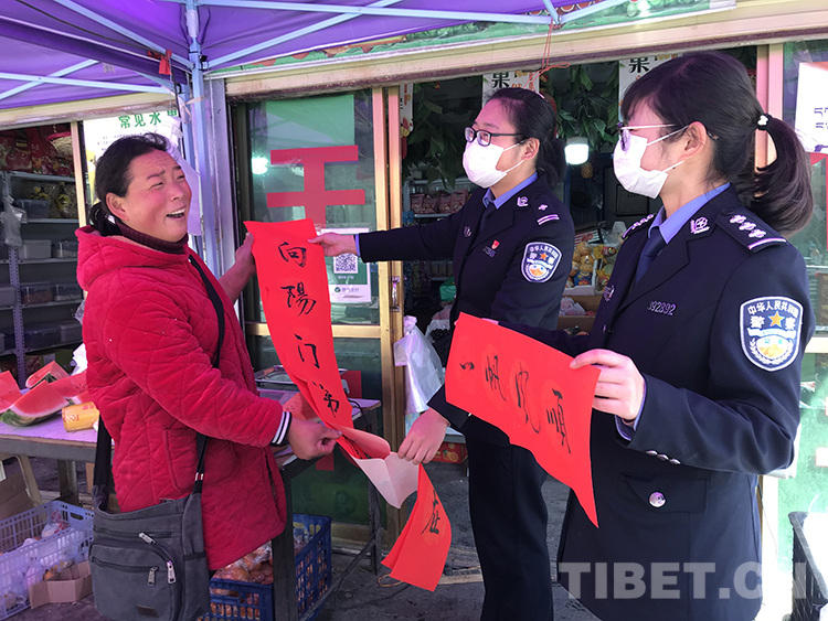 2月7日,拉薩邊檢站邀請拉薩市文聯(lián)書法家協(xié)會共同開展“同心同書——祖國新春好”送萬福進萬家活動。4名書法家揮毫潑墨,書寫漢文藏文春聯(lián),散發(fā)著墨香的春聯(lián)凝聚著無限的祝福。隨后,邊檢站格?;ㄅ訄?zhí)勤隊民警為駐地商戶送“福”送春聯(lián)。在駐地的一家超市,商戶張大姐興高采烈地與民警一邊貼春聯(lián),一邊笑著說:“感謝你們送來的新春祝福。今年雖然沒能回家過年,但有你們的陪伴照顧,我們感到很開心?!?/p>