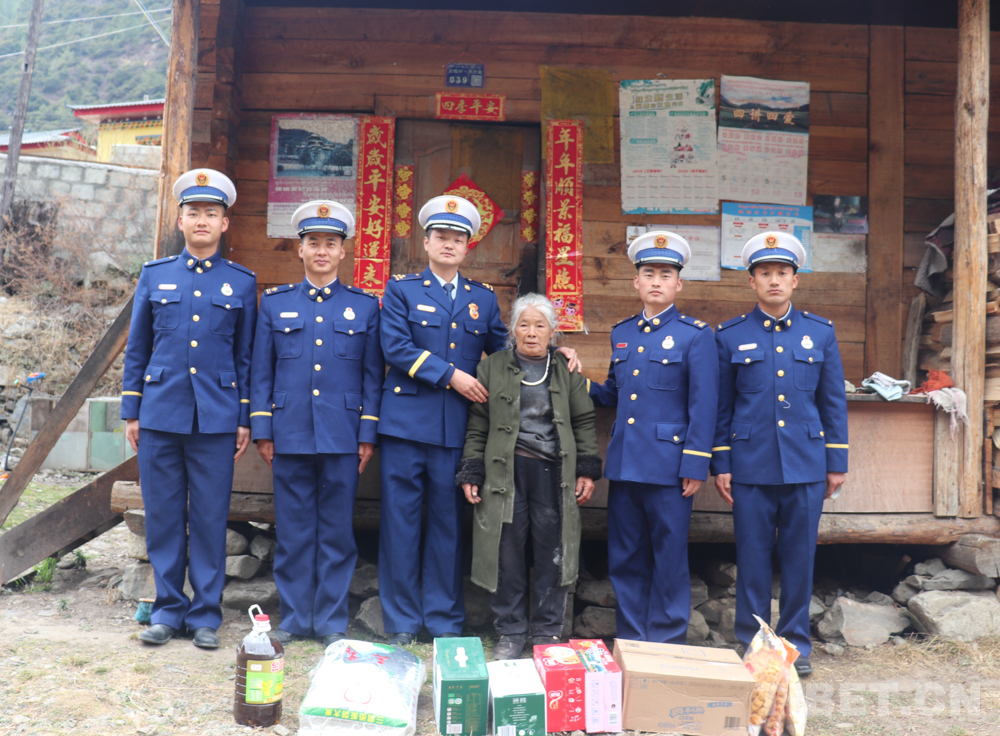 伴隨著冬日里溫暖的陽(yáng)光,中隊(duì)指戰(zhàn)員代表帶著慰問(wèn)品和節(jié)日的祝福來(lái)到了卓給阿媽家中,阿媽高興地迎接大家。指戰(zhàn)員們?yōu)榘審堎N對(duì)聯(lián)、整理衣物、收拾衛(wèi)生,給阿媽測(cè)量血壓,與阿媽拉家常,小屋沉浸在溫馨祥和的氛圍中。阿媽拉著指戰(zhàn)員的手說(shuō)道:“謝謝你們經(jīng)常來(lái)看我,我雖然沒(méi)有兒女,有你們的掛念,心里很滿足。”臨走時(shí),指戰(zhàn)員再三叮囑阿媽有困難一定要及時(shí)聯(lián)系,她的“兒子”會(huì)經(jīng)常來(lái)看望。