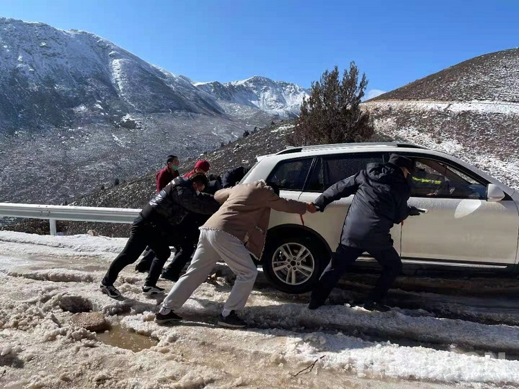 面對(duì)焦急萬分的父親,為了讓病中的孩子第一時(shí)間得到醫(yī)治,根秋降澤立即下車施救。由于鄉(xiāng)村道路路況較差,加之冰雪覆蓋,車輛打滑嚴(yán)重,施救過程十分艱難。根秋降澤憑借多年應(yīng)對(duì)冰雪路況的駕駛經(jīng)驗(yàn),組織大家在極度嚴(yán)寒、工具缺乏的情況下,通過刨冰除雪、手推車?yán)姆绞?,?jīng)過半個(gè)多小時(shí)的努力終于讓被困車輛擺脫困境。根秋降澤捂著凍僵的手,一再提醒駕駛員要常備防滑鏈條,在冰雪路段需小心謹(jǐn)慎駕駛,切勿急打方向等注意事項(xiàng)。