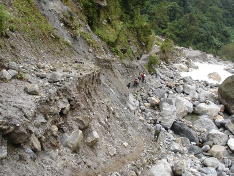 2005年6月墨脫公路段出現(xiàn)自然塌方損毀嚴(yán)重。