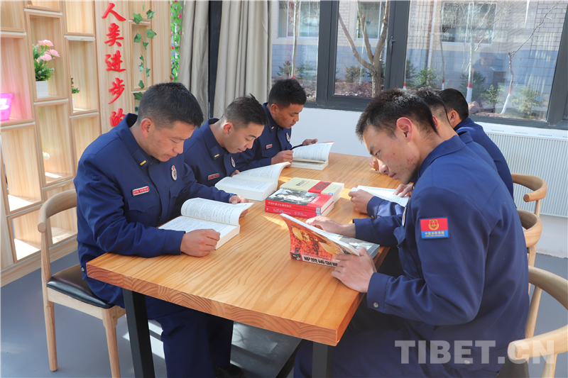 圖為西藏昌都市卡若區(qū)森林消防中隊學習黨史書籍