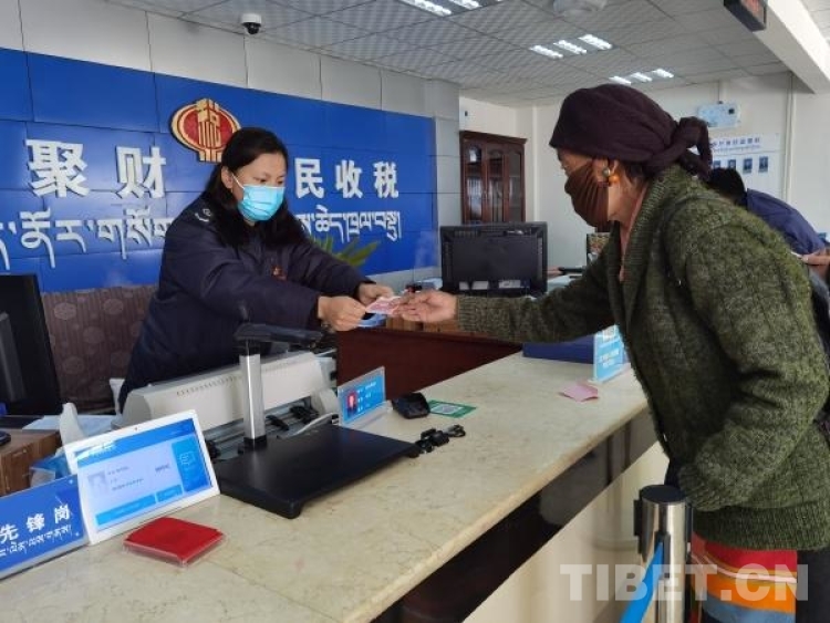 圖為國家稅務總局薩迦縣稅務局辦稅服務廳里稅務人員在為群眾辦理業(yè)務