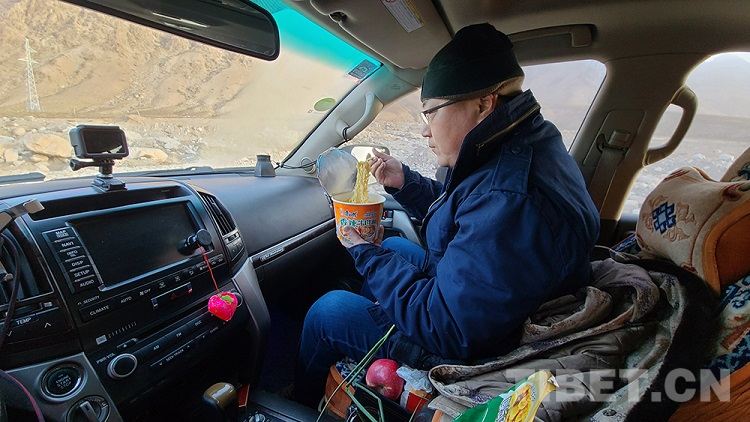 圖為呂智勇自駕向阿里普蘭運(yùn)送防疫物資期間,在車?yán)锍苑奖忝?/p>
