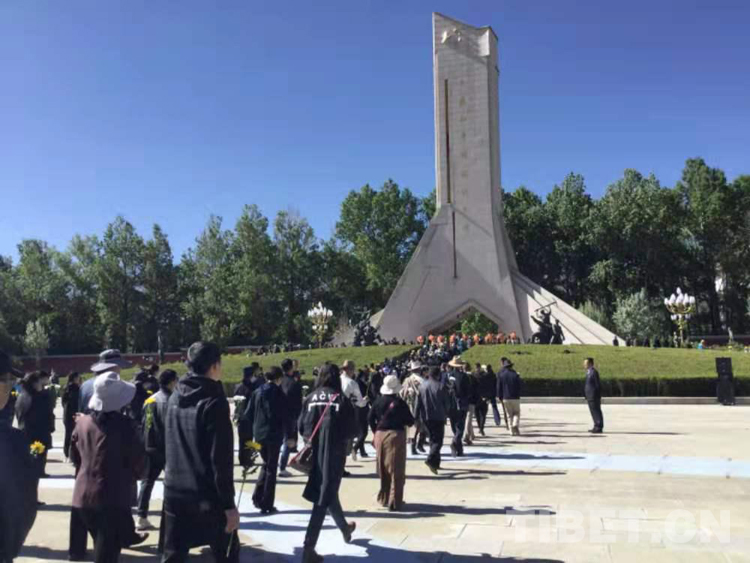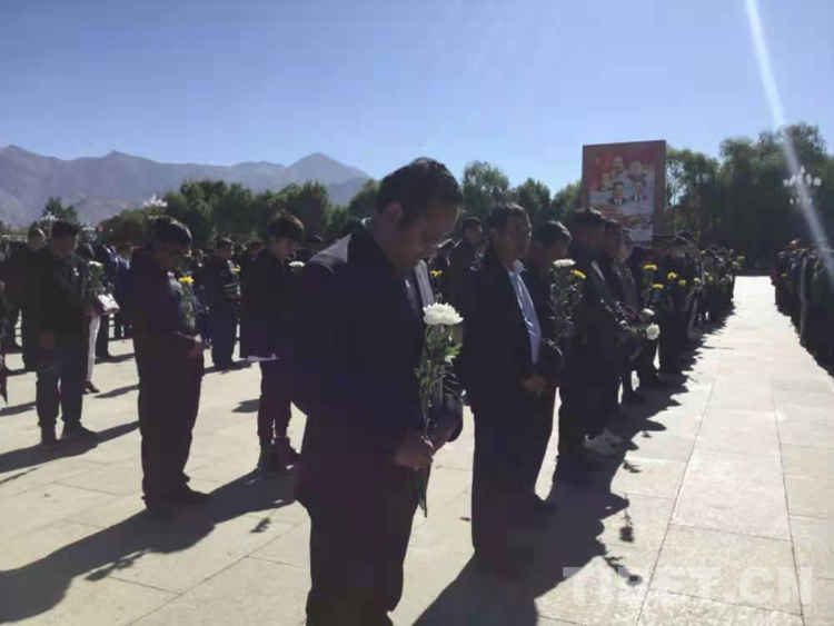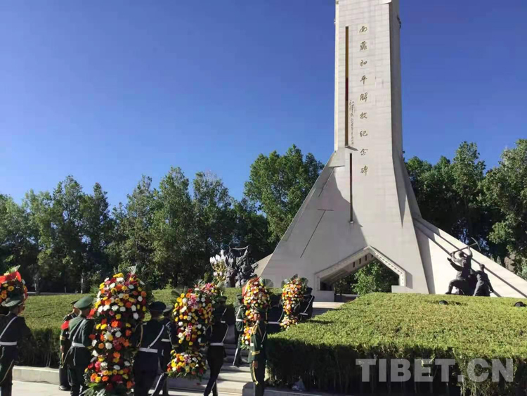 中共西藏自治區(qū)委員會、西藏自治區(qū)人大常委會、西藏自治區(qū)人民政府及各界群眾等分別敬獻(xiàn)的9個大型花籃一字排開,花籃紅色緞帶上書寫“革命先烈永垂不朽”8個金色大字。