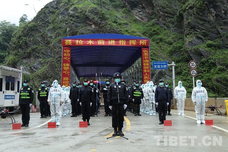 圖為聶拉木出入境邊防檢查站移民警察聯(lián)合地方單位在友誼橋頭表決心 西藏出入境邊防檢查總站供圖