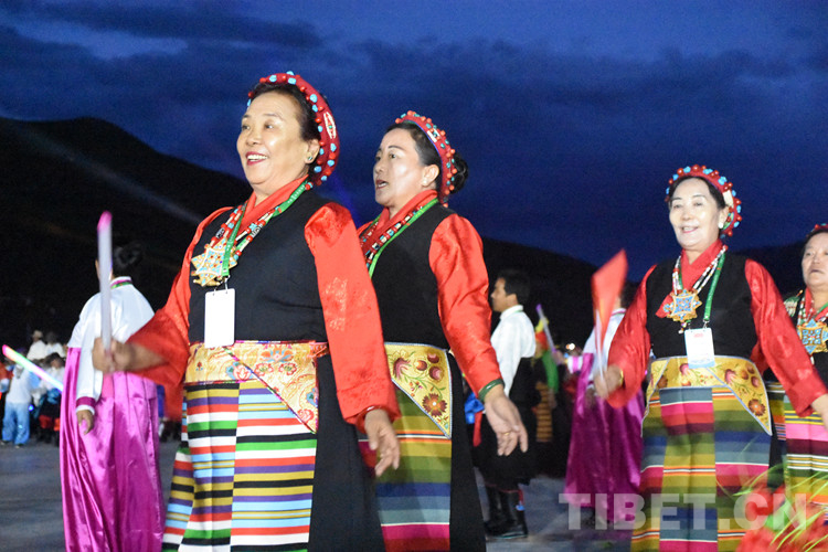 珠峰文創(chuàng)園區(qū)的聯(lián)歡活動分為三個章節(jié),以《在燦爛的陽光下》《各族人民感恩黨》《西藏人民齊歡唱》三首歌曲作為開篇樂,來自日喀則各族各界的演員們,身著日喀則特色節(jié)日盛裝,在廣場中央,擺出數(shù)字“100”的造型,跳起歡快的鍋莊舞,在燈光的輝映下,造型美輪美奐。
