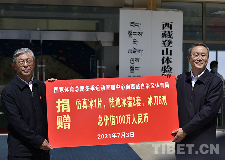 中國(guó)西藏網(wǎng)訊 7月3日,國(guó)家體育總局冬季運(yùn)動(dòng)管理中心向西藏自治區(qū)體育局捐贈(zèng)物資儀式在拉薩市舉行。西藏自治區(qū)體育局獲贈(zèng)仿真冰、陸地冰壺、冰刀等總價(jià)值100萬元的設(shè)施設(shè)備,助力冬季運(yùn)動(dòng)項(xiàng)目發(fā)展。