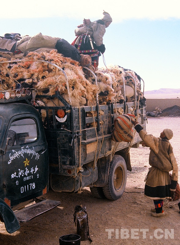 這是藏北雙湖辦事處(現(xiàn)雙湖縣)和平鄉(xiāng)牧民正在裝車外運(yùn)交售的畜產(chǎn)品(唐召明1987年攝)
