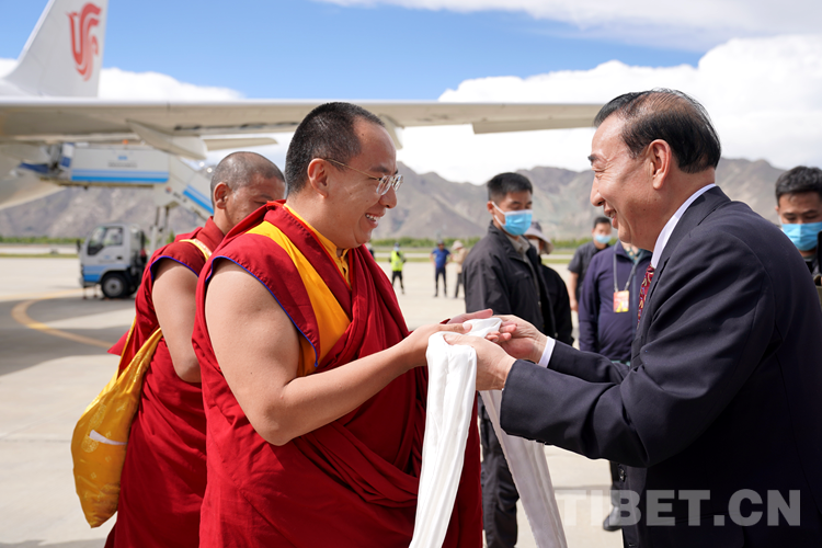 西藏自治區(qū)黨委常委、統(tǒng)戰(zhàn)部部長(zhǎng),區(qū)政協(xié)黨組副書記、副主席旦科等西藏自治區(qū)相關(guān)領(lǐng)導(dǎo)在貢嘎機(jī)場(chǎng)迎接,互敬哈達(dá)。