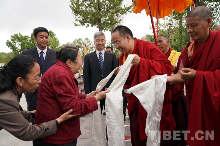 圖為西藏自治區(qū)黨委常委、統(tǒng)戰(zhàn)部部長(zhǎng),區(qū)政協(xié)黨組副書記、副主席旦科與班禪互敬哈達(dá)、互致問候 攝影:王淑