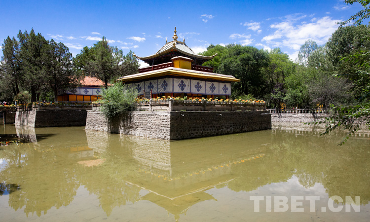 這座隱匿于茂密園林中的宮殿,上下兩層設(shè)計(jì)精巧別致,漢白玉石欄,核桃木地板,南北通透的玻璃窗和滿墻滿壁的點(diǎn)染,勾畫著的高原勝跡。壁畫環(huán)繞四壁,極為養(yǎng)心養(yǎng)眼。
