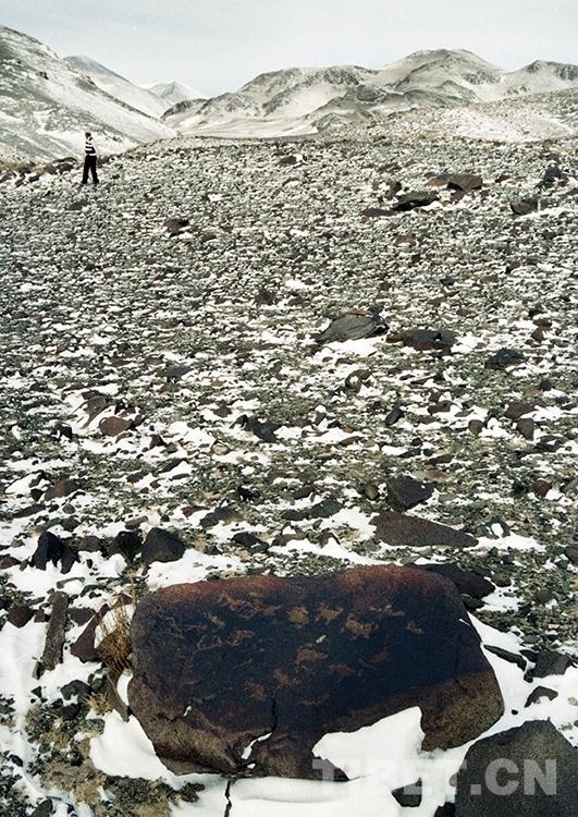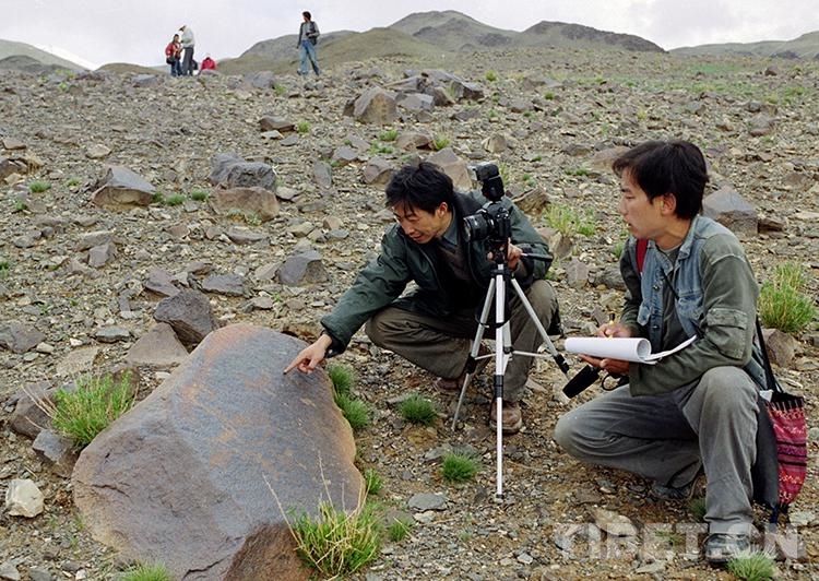 這是藏北無人區(qū)科考團科考人員在對尼瑪縣榮瑪鄉(xiāng)加林山巖畫進行科學(xué)考察(唐召明2001年攝)